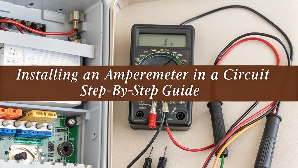 To install an ammeter in a circuit, start by disconnecting the battery for safety. Identify and cut the charging wire from alternator to battery, then strip its ends. Connect the ammeter with heavy gauge wire, ensuring the positive aligns properly. All electrical loads should link to the ammeter’s positive terminal. Reconnect the battery, positive first, and check for stable readings. By progressing further, you’ll grasp detailed solutions for precise installation.